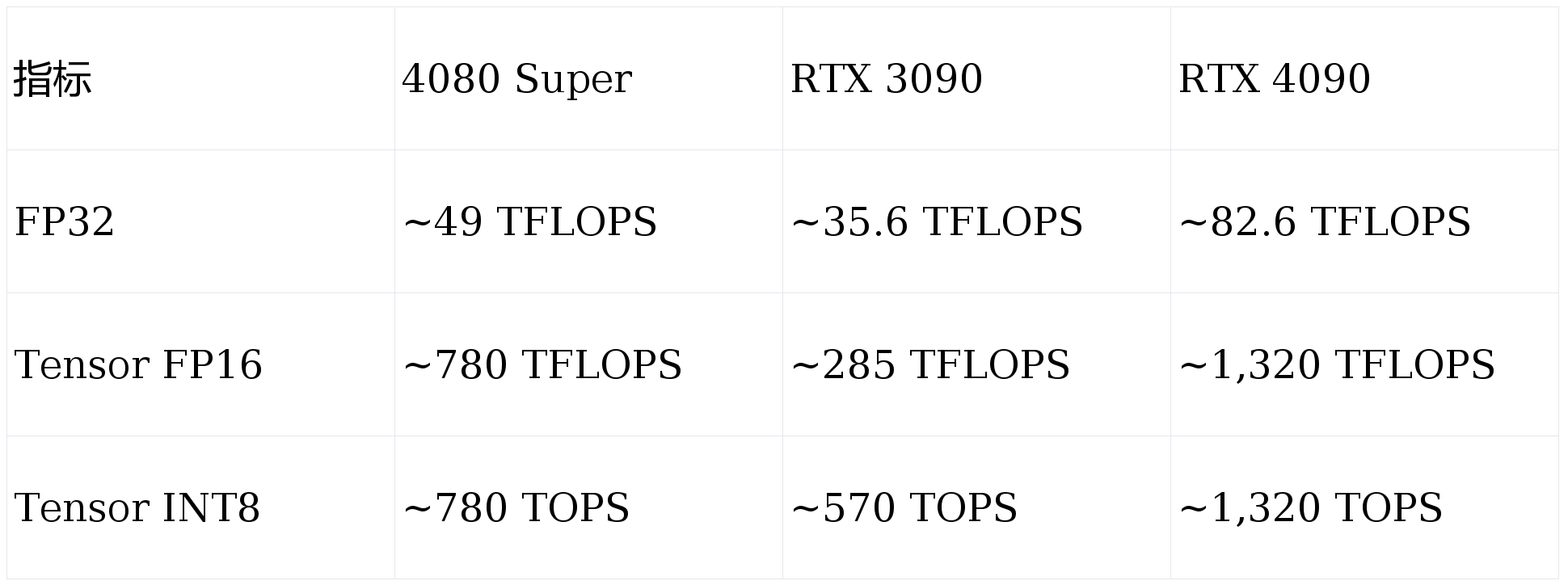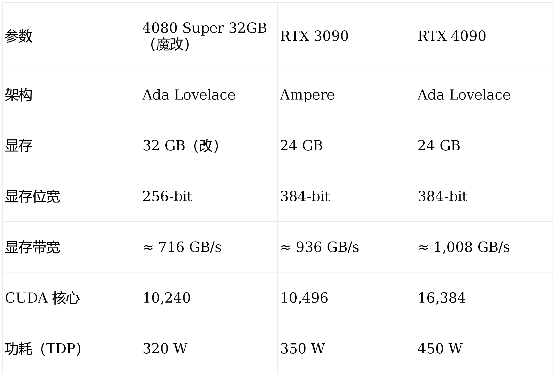 一句话总结各项对比:显存容量 4080 32G > 4090 ≈ 3090;带宽 4090 > 3090 > 4080;AI 算力 4090 >> 4080 > 3090;AI 推理性价比 4080 32G 优势明显。