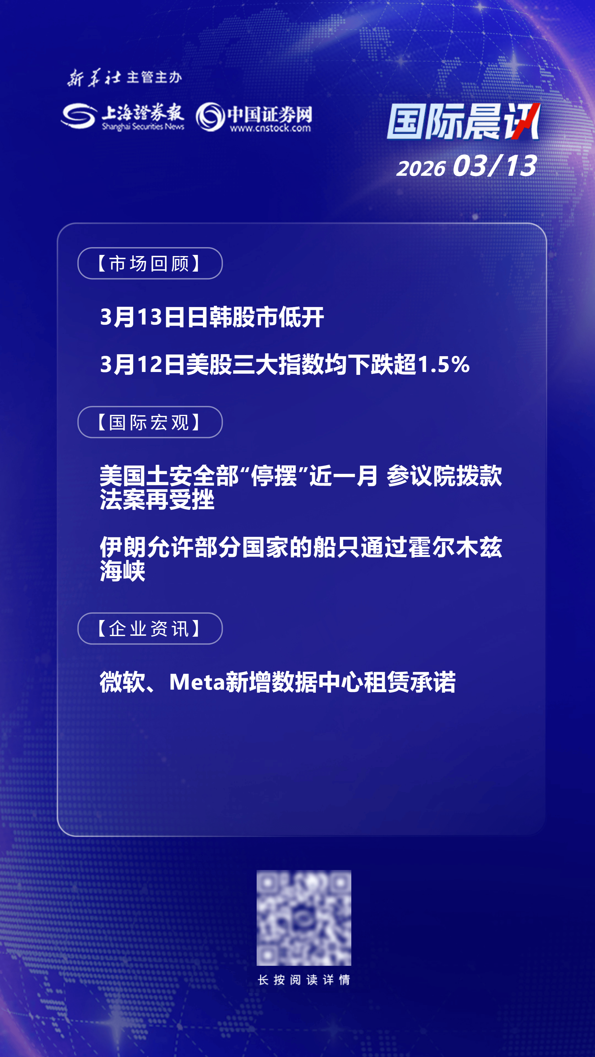 北京时间周五,日韩股市低开;美东时间周四,美股三大指数均下跌超过1.5%;据新华社援引伊朗伊斯兰共和国通讯社12日报道,伊朗副外长拉万奇当天在接受媒体采访时表示,伊朗允许部分国家的船只通过霍尔木兹海峡;微软公司与Meta在最近一个季度分别新增了近500亿美元的数据中心租赁承诺,以支持人工智能的发展。