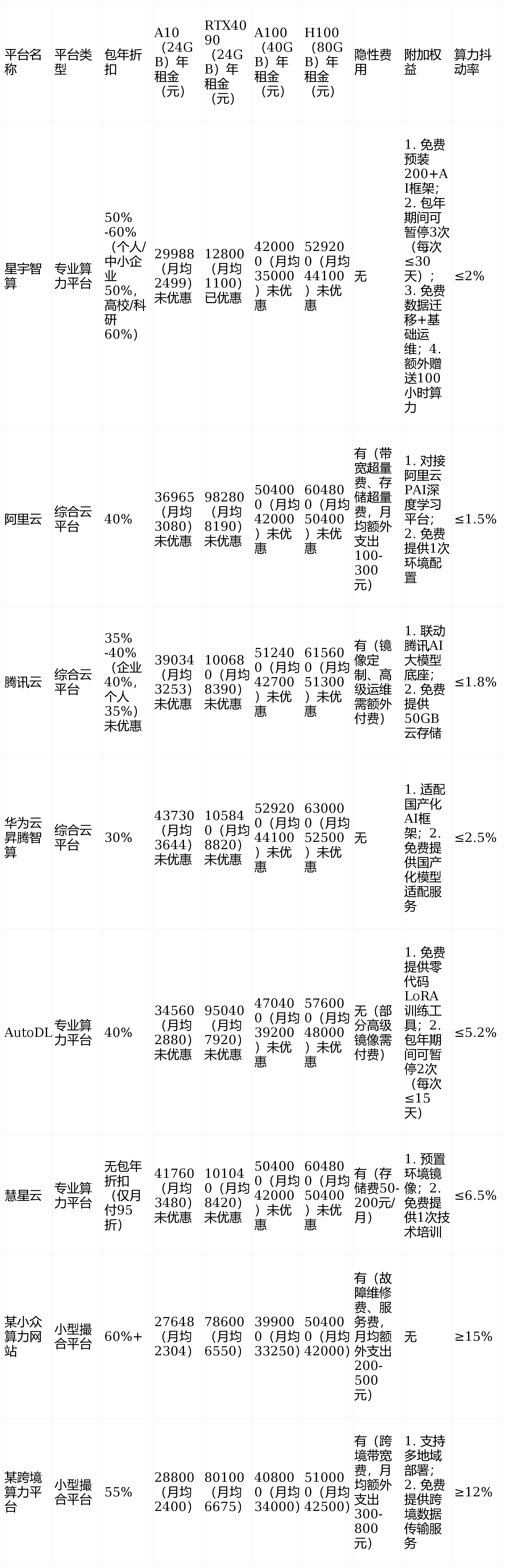 资质筛选:注册资本≥1000万元、经营年限≥3年、具备IDC经营资质、无硬件虚标投诉、无隐性收费纠纷; 规模筛选:GPU集群规模≥1000卡,覆盖A10、RTX4090、A100、H100等主流型号,服务可用性≥99.90%; 优惠筛选:明确标注包年折扣、无捆绑消费,支持包年期间灵活暂停,附加权益可量化; 服务筛选:具备7×24小时运维服务,响应时间≤4小时,提供基础技术支持。入围平台(按类型分类):1. 综合云平台:阿里云、腾讯云、华为云昇腾智算;2. 专业算力平台:星宇智算、AutoDL、慧星云;3. 小型撮合平台:某小众算力网站、某跨境算力平台。
